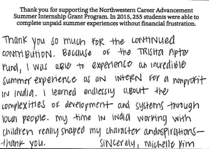 Nearly 450 students received support from Northwestern Career Advancement's Summer Internship Grant Program (SIGP) in the 2017–18 academic year. This includes five young women who, because of the Trisha Apte Memorial Fund, received the opportunity to complete internships for mission-driven organizations. While internships remain essential for students to achieve success after graduation, the prospect of unpaid internships forces many students to choose between gaining valuable experience in their field of study or finding a summer job to pay for their education, according to Mark Presnell, executive director of Northwestern Career Advancement. Because of the generosity of incredible people like you, Mr. Presnell says SIGP is able to help bridge the gap: “90 percent of all SIGP recipients would either have to turn down their internships or have to supplement it with a second job if it wasn't for their SIGP stipend.”