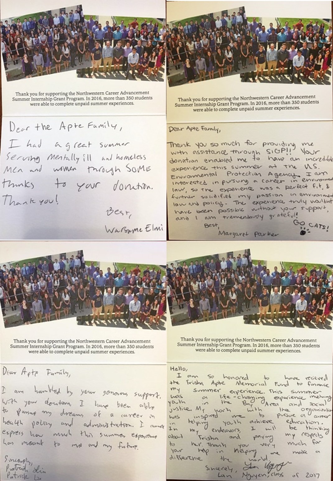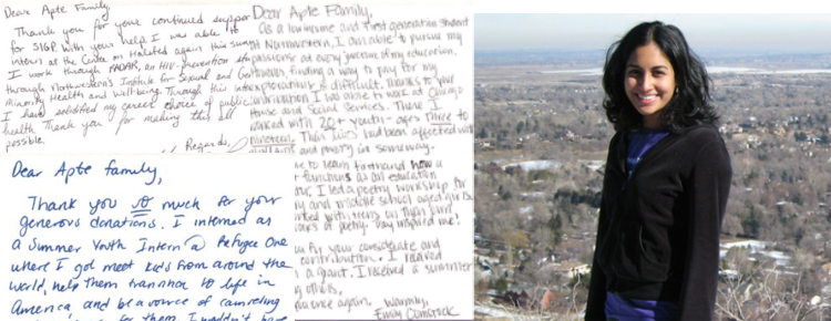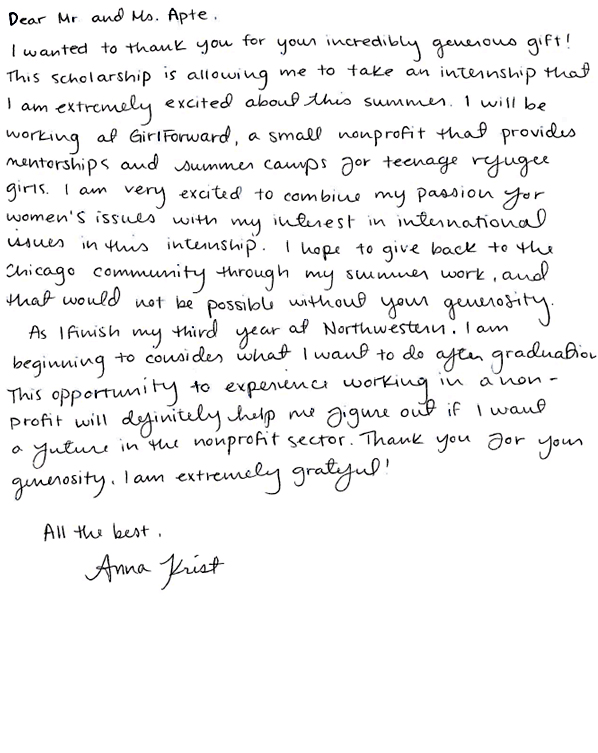 As a result of Suhas and Megha Apte's generous endowment support and investments in the Trisha Apte Memorial Fund as partners in creating opportunities for Northwestern University's faculty and students to achieve excellence in the classrooms, four ambitious and intelligent students received grants to pursue their dreams during the 2016 Summer Internship Grant Program.