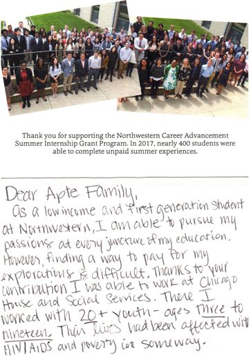 As a result of Suhas and Megha Apte's generous endowment support and investments in the Trisha Apte Memorial Fund as partners in creating opportunities for Northwestern University's faculty and students to achieve excellence in the classrooms, four ambitious and intelligent students received grants to pursue their dreams during the 2017 Summer Internship Grant Program.