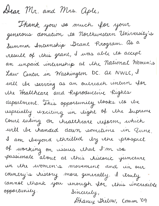As a result of Suhas and Megha Apte's generous endowment support and investments in the Trisha Apte Memorial Fund as partners in creating opportunities for Northwestern University's faculty and students to achieve excellence in the classrooms, nine ambitious and intelligent students received grants to pursue their dreams during the 2014 Summer Internship Grant Program.