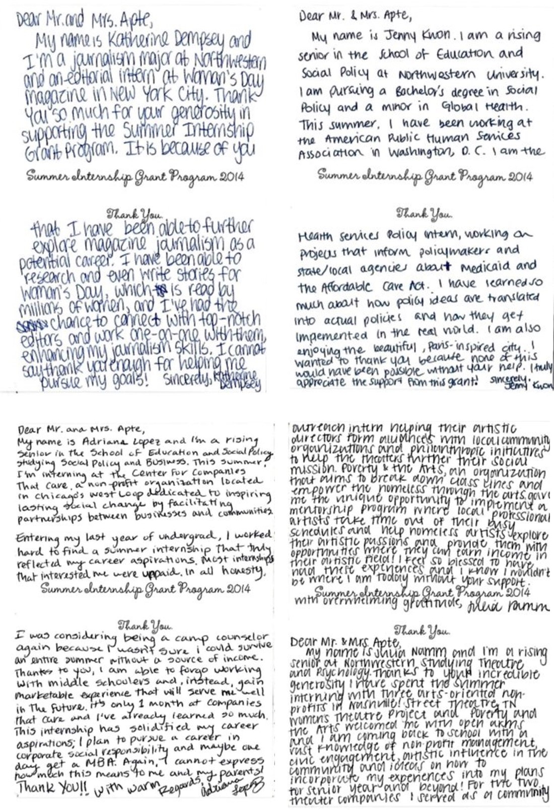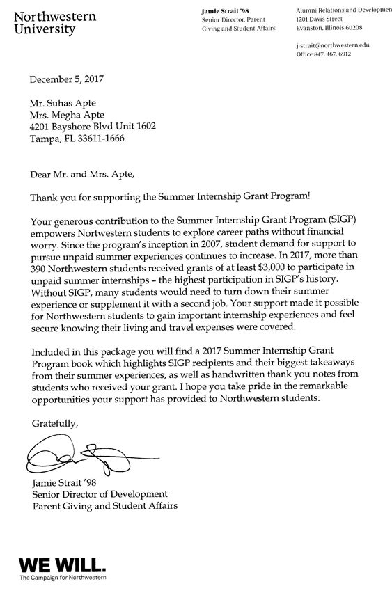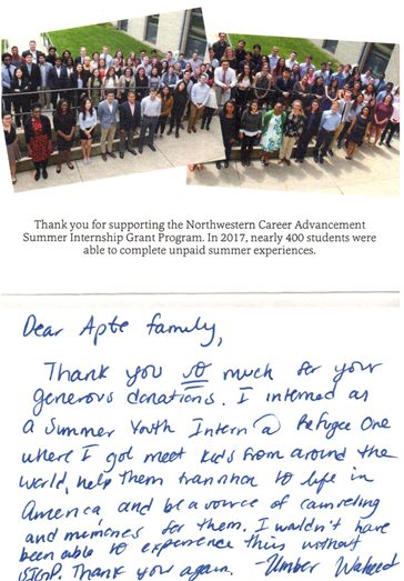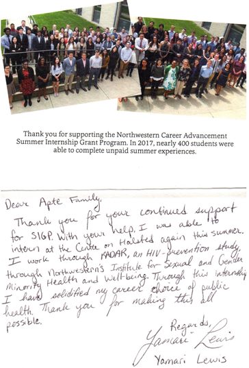 As a result of Suhas and Megha Apte's generous endowment support and investments in the Trisha Apte Memorial Fund as partners in creating opportunities for Northwestern University's faculty and students to achieve excellence in the classrooms, four ambitious and intelligent students received grants to pursue their dreams during the 2016 Summer Internship Grant Program.