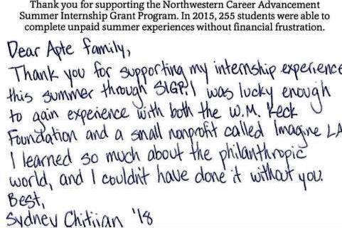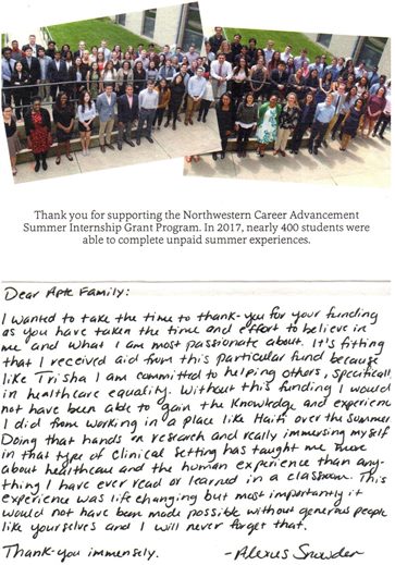 Nearly 450 students received support from Northwestern Career Advancement's Summer Internship Grant Program (SIGP) in the 2017–18 academic year. This includes five young women who, because of the Trisha Apte Memorial Fund, received the opportunity to complete internships for mission-driven organizations. While internships remain essential for students to achieve success after graduation, the prospect of unpaid internships forces many students to choose between gaining valuable experience in their field of study or finding a summer job to pay for their education, according to Mark Presnell, executive director of Northwestern Career Advancement. Because of the generosity of incredible people like you, Mr. Presnell says SIGP is able to help bridge the gap: “90 percent of all SIGP recipients would either have to turn down their internships or have to supplement it with a second job if it wasn't for their SIGP stipend.”