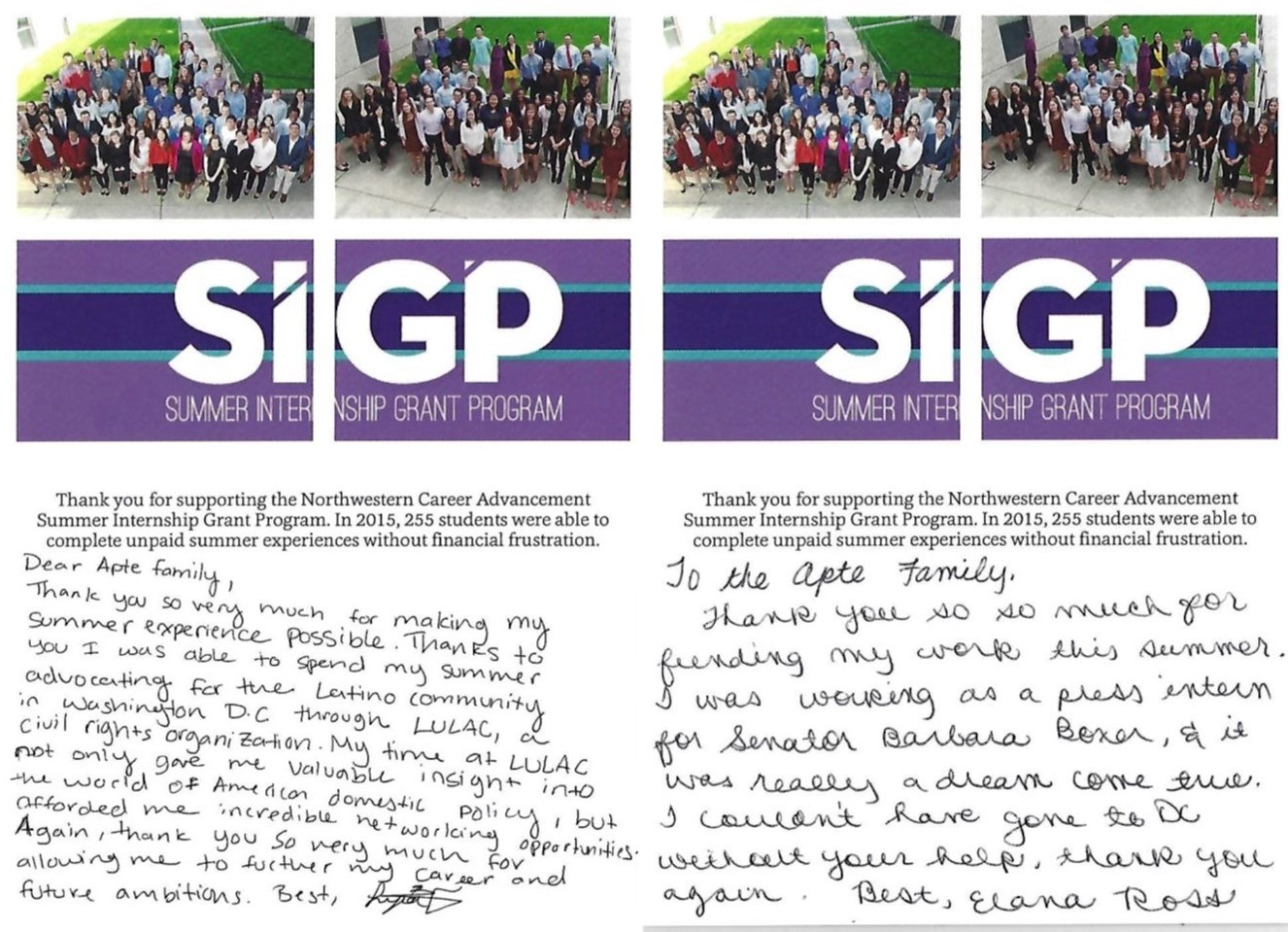 More than 250 Northwestern students who received grants of at least $3,000, participated in unpaid summer experiences without financial frustration as part of the Northwestern Career Advancement's Summer Internship Grant program. The 255 students from 7 schools/colleges went to 24 states, the District of Columbia and 24 Countries. 86% of whom would have had to turn down their summer experience or supplement the experience with a second job if it had not been for SIGP funding